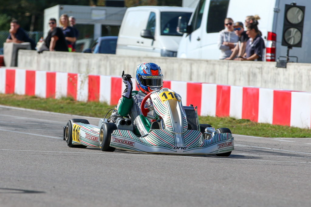 Gastfahrer Lenny Ried (Ehingen/Solgat Motorsport) führte die OK Junior am Samstag an. Nach der Pole-Position im Zeittraining, verteidigte er seine Führung auch im Verlauf der Heats. In bester Form präsentierte sich Daniel Hunecke (Wenden/Lanari Racing Team) im ersten Finale am Sonntagmorgen. Von Startplatz sechs aus fuhr er innerhalb von zwei Runden an die Spitze und baute seine Position kontinuierlich bis zum Fallen der Zielflagge aus. Als zweiter behauptete sich Ried vor Linus Hensen (Jübeck/Kartschmie.de) auf Position drei. Sebastian Kraft (Aeschlen/TB Racing Team) überquerte als vierter den Zielstrich, fiel durch eine Spoilerstrafe aber auf Platz sechs hinter Maxim Rehm (Blaubeuren/Rehm Racing) und Luca Leistra (Schoten/RS Schumacher Racing Team) zurück. Letzterer zeigte eine beachtliche Aufholjagd: Nach dem Qualifying war er nur 33. und fuhr nun in die Pokalränge.