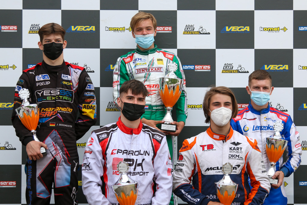 Für Überraschungen sorgten in Kerpen die 31 OK Junioren. Zu Beginn der Veranstaltung zeichnete sich Maxim Rehm (Blauberen/Rehm Racing) als klarer Favorit für die Rennsiege ab. Mit der Pole-Position und zwei Siegen in den Vorläufen erlebte der Youngster einen perfekten Samstag – steckte in den Rennen aber zurück. Im ersten Durchgang setzte sich Maximilian Schleimer (Obertiefenbach/Giti Tire Motorsport by WS Racing) direkt nach dem Start in den Windschatten des Polesetters und nutzte seine Chance. In der sechsten Runde gelang Schleimer sein Angriff auf die Spitzenposition und fuhr vor Rehm zu seinem ersten OK Junior-Erfolg. „Das ist ein Megagefühl hier gewonnen zu haben. Wir waren schon gestern konkurrenzfähig, der Sieg ist nun das Sahnehäubchen“, freute sich der 13-jährige Rheinland-Pfälzer. Tom Kalender (Hamm-Sieg/TB Racing Team) komplettierte das Führungspulk als Dritter und beendete das Rennen vor Taym Saleh (Viernheim/TB Racing Team) und Enrico Förderer (Leuterod/BirelART Racing KSW).
