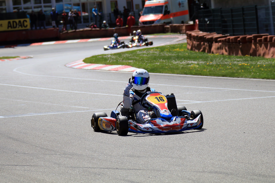 Josh Dufek (Altendiez/HTP Kart Team) eroberte nach einer blitzsauberen Vorstellung am Samstag die Favoritenrolle und knüpfte daran auch im ersten Finale an. Nach dem Start verteidigte er seine Führung. Die Konkurrenz ließ sich diesmal aber nicht so leicht abschütteln. Magnus Bockstette (Lemgo/Ostwestfalen-Lippe e.V.) nutzte eine Lücke und zog an Dufek vorbei. Der schaffte aber den Konter und fuhr nach 15 Runden als Sieger über den Zielstrich. Eine spätere zehn Sekundenstrafen schmälerte jedoch die Freude des HTP-Schützlings. In der Endabrechnung fand sich Daniel Gregor (Leinsweiler/Team Zinner) an der Spitze des Feldes wieder. Philipp Damhuis (Haren/Team Hemkemeyer) und Valentino Catalano (Westheim/Kali-Kart Stern Motorsport) komplettierten die Podestränge. Vierter und Fünfte wurden Marcel Schminke (Bad Wildungen/RMW Motorsport) und Claudia Henning (Waidhofen/DR Germany).