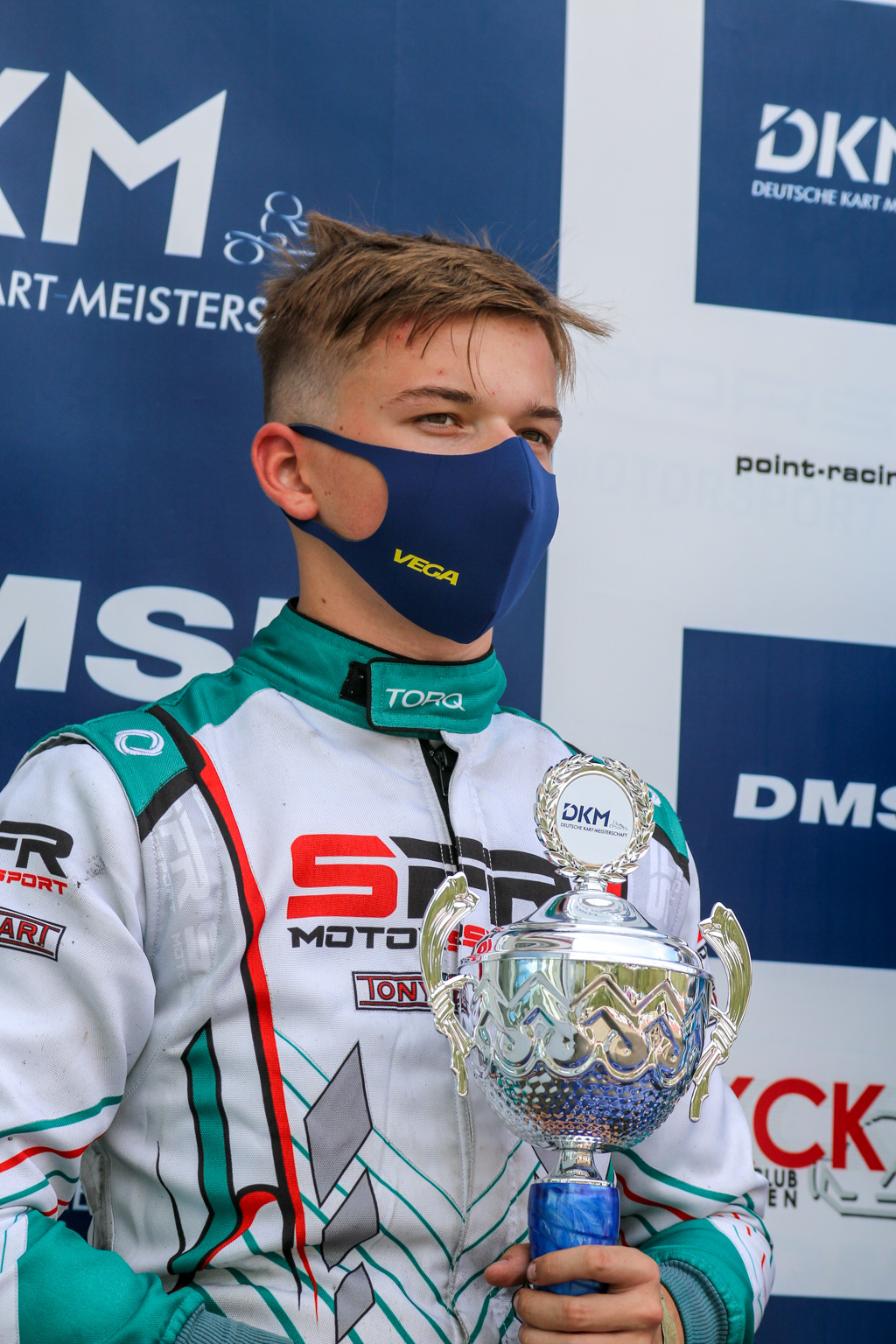 Für Jubel sorgte dagegen Sandro: Nach einem verhaltenen elften Platz im ersten Lauf, preschte er im Nachmittagsrennen nach vorne und holte als Vierter seinen ersten Pokal in der Deutschen Kart-Meisterschaft. „Endlich hatte es zum Sprung in die Top-Fünf gereicht. Das gesamte Team macht einen tollen Job und stellt uns konkurrenzfähiges Material zur Verfügung. Daran möchten wir nun weiter anschließen“, resümierte Sandro.