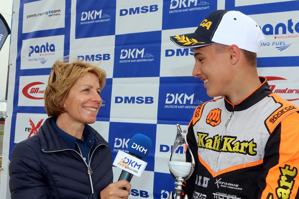Für das zweite Finale hätte man kein besseres Drehbuch schreiben können. Hiltbrand verteidigte auf den ersten Metern seine Führung, doch von hinten machte Federer Druck und zog an dem Weltmeister aus 2016 vorbei. Lange währte seine Freude über die Führung nicht, nach nur zwei Runden stellte der Südtiroler sein Kart im Aus ab. Gleichzeitig setzte auch noch Regen ein und Rennleiter Thomas Lainer sah sich gezwungen den Lauf zu unterbrechen. Doch während der Zwangspause hörte es wieder auf zu regnen und nur Daniel Stell (Mach1 Motorsport) setzte aus der Führungsgruppe trotzdem auf Regenreifen. Am Ende ging der Poker des Bayern auf. Nach dem er zwischenzeitlich durch Stan Pex (CRG Holland) eingeholt wurde, war der Regen letztlich zu stark für die Slickreifen und der Niederländer musste sich trotz einer beachtlichen Fahrt geschlagen geben. Für Stell war es der erste Sieg in der höchsten Deutschen Kartrennserie, entsprechend glücklich war er auf der obersten Stufe des Siegerpodiums: „Das war ein reines Glückspiel, welches diesmal zu meinen Gunsten entschieden wurde. Ich danke meinem ganzen Team für die Unterstützung an diesem Wochenende. Wir haben gemeinsam gewonnen.“ Der sechsfache Meister Jorrit Pex (CRG Holland) reihte sich als Dritter ein. Ebenfalls auf Regenreifen unterwegs war der Vierte Kristijan Habulin (KK1), Fünfter wurde der Schwede Emil Skäras (Energy Corse).