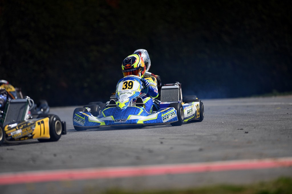 Fabian Federer unterstrich bereits am Samstag seine Vorliebe für die Rennstrecke unweit entfernt vom Gardasee. Der Südtiroler holte eine Bestzeit im Qualifying und führte auch am Samstagabend das Zwischenklassement an. Doch im ersten Rennen übernahm Pedro Hiltbrand (CRG Holland) das Zepter und kam bis zum Überqueren der Ziellinie nie in Gefahr seinen Spitzenplatz zu verlieren. „Das war ein hartes Rennen für mich. Die 21 Runden waren deutlich anstrengender als Heats gestern. Am Ende habe ich es aber geschafft und bin glücklich gewonnen zu haben. Hinter dem Spanier war es dagegen deutlich knapper. Während Christopher Hold (Maranello Kart) starker Zweiter wurde, gab es dahinter noch auf den letzten Metern eine Verschiebung. Polesetter Fabian Federer (SRP Racing Team) kämpfte sich mit einem Last-Minute-Manöver an Jorrit Pex (CRG Holland) vorbei und stand als Dritter auf dem Podium. Abgeschlossen wurden die Pokalränge vom Deutschen Alexander Schmitz.