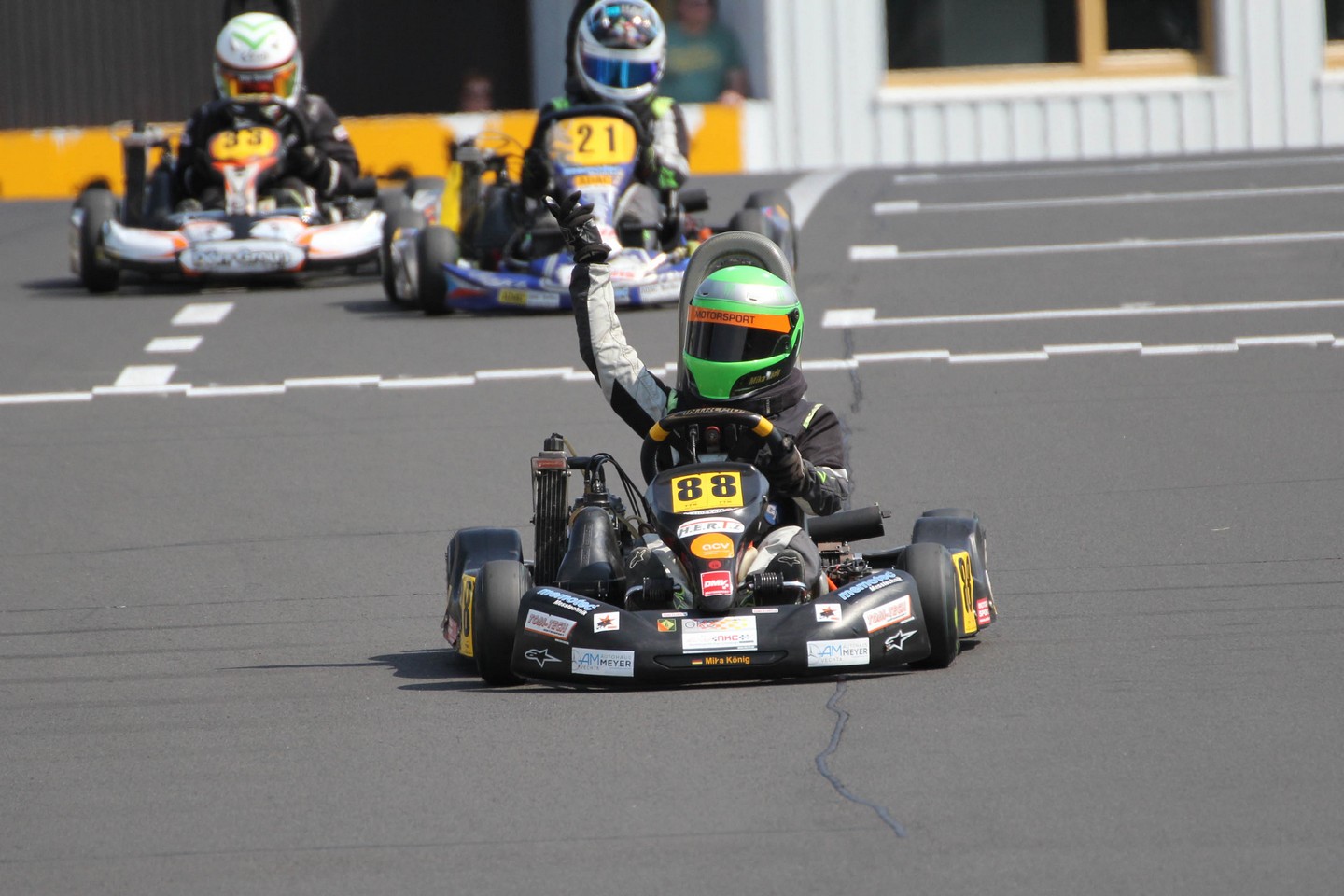 Im Finale ließ Hofer an der Spitze nichts anbrennen. Fast schon spielerisch konnte sich der Ricciardo-Fahrer von den Verfolgern absetzen und den Doppelsieg perfekt machen. Dahinter stritten sich bis zu fünf Piloten um die Ehrenplätze, wobei Marcel Schirmer (RS Competition) am Ende die Nase vorn hatte. „Nachdem wir den ganzen Samstag kaum zum Testen kamen, weil wir Aussetzer hatten, ist das ein super Ergebnis”, strahlte Schirmer, der damit die Meisterschaftsführung ausbauen konnte. Aber auch der am Ende Drittplatzierte Marco Göttler war zufrieden, holte er sich doch ebenso wie der Viertplatzierte Kai Honné (CRG Racing Team) sein bestes Saisonergebnis. Pech hatte hingegen Luka Kamali, der ursprünglich als Dritter abgewinkt worden war, aber aufgrund einer Zeitstrafe auf Position neun abrutschte. In die Top-Ten schaffte es noch Pascal Marschall. Nach seinem Wertungsausschluss vom Ende des Feldes gestartet, arbeitete er sich bis auf Rang acht vor und konnte wiederum die schnellste Rennrunde fahren.